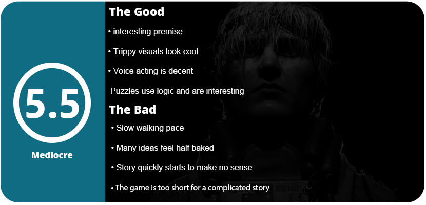 This is another game that can’t tell its overcomplicated story in just 4 short hours. Instead, we have just a walking simulator with a few puzzles and other half-baked ideas. You get a camera at one point and must use it to take pictures of eyeballs to open doors, but this feels half-baked. The areas are super tiny. One single area has you leading a creature around a specific path to get it to stop so you can take a photo of its face to kill it. This all feels half-baked, like they were neat ideas that had to be quickly shoved into a single scene. Once you get past the 5-10 minutes of gameplay, you endure the sluggish walking pace of more trippy visuals, such as flying through space, moving a cube through simulated cyberspace, walking through offices full of piles of CRTs, etc. The weird scenes are incredibly artistic and interesting, but in the end they don’t add any value to the story.