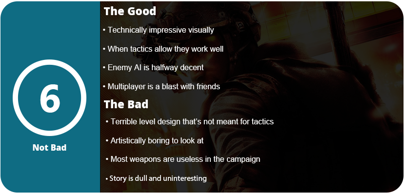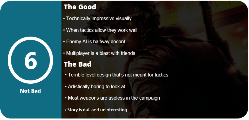 The only tactical part of the game is stacking up on doors and breaching them. You can snake cam under a door and tag up to two enemies. You can then order your teammates to breach, frag, or enter and clear a room. That’s it. You can order them up ladders, and you can occasionally rope down the side of the building and turn upside down to shoot inside, which was really fun, but there were only a few times you could do this. Most of the game is just moving from room to room and killing everything in sight, and it gets old really quick. There’s no variation, and you can’t even use the turrets in the game to make some fights a bit easier. I also found that checkpoints were poorly placed. I would need to have a teammate hack a computer, and then I would need to cover them. Instead of restarting before the hack, I would restart two to three rooms back and have to keep clearing them. This game becomes a frustrating chore after awhile because you can’t use any tactics in this game. It’s trying to be Rainbow Six mixed with some Ghost Recon and Call of Duty.