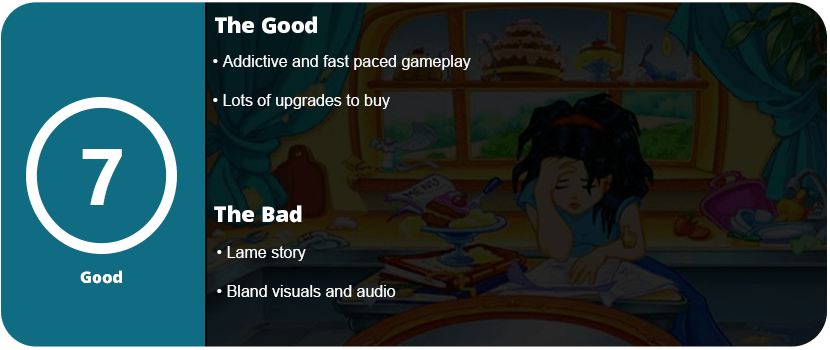 The audio is just as plain as the visuals, with annoying one-track-repeating BGM, a few whooshing, and whizzing sound effects, and that pretty is the whole pie…or cake. So with a retarded story and plain audio and visuals, what you have left is a layer of vanilla cake with vanilla icing that tastes good but doesn’t really make your mouth water. With the cheap price point, you’ll be strangely and sickeningly addicted to this Diner Dash-inspired game.