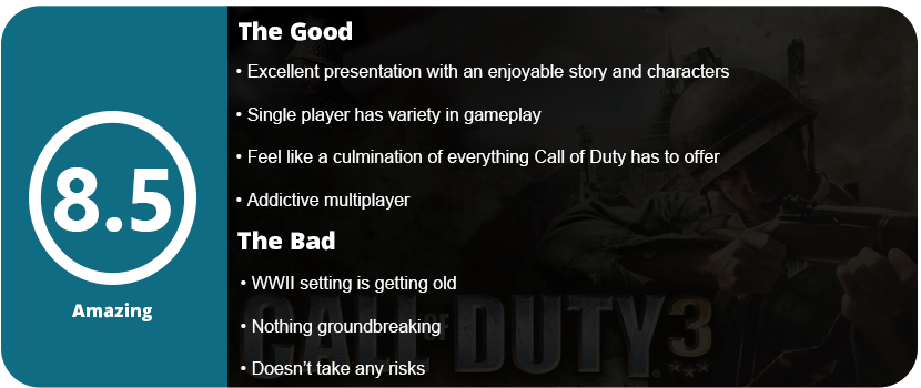 I just wish they’d make a game of WWI or the Revolutionary War! Once you finish everything here, you can look under the extras for concept art, videos, etc. The achievements make for playing single-player more than once, and overall, this is a solid WWII shooter, but we all know it wasn’t the last one.