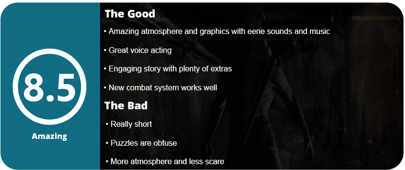 This is really great, and thankfully Konami kept all of this in mind for fans, but what if you’ve never played an SH game before? Well, then you came in at a great time. Most people’s concern is if the game has the same creepy atmosphere, and it does. There are fewer “out of the closet” scares, however, because the game concentrates more on the sheer atmosphere. Everything is dark and creepy, and we have the same spooky, unnerving sound effects and music that we’ve grown to love. The combat system is what I was mainly concerned about. Gone are the fixed camera angles and tank controls. The game controls very well in a third-person-style action game. You lock on to enemies and use light and heavy attack combos to kill them. This may be very repetitive and simple, but it’s better than being broken. Shooting is easier as well because you know how to control the gun in a Resident Evil 4 way.