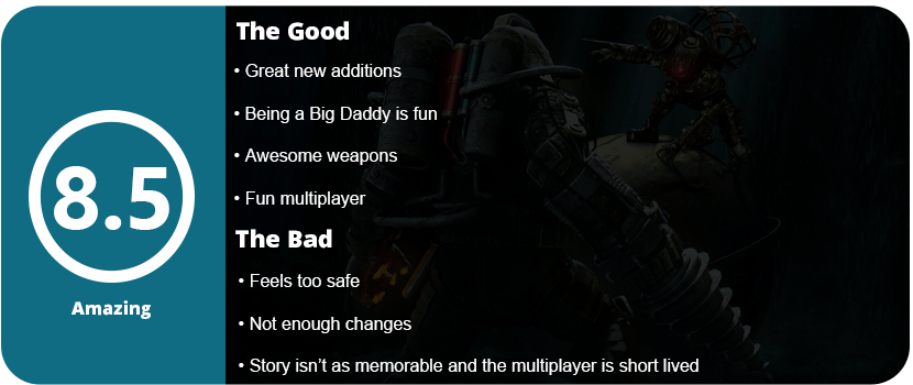All in all, BioShock 2 is a solid sequel with fun multiplayer, but the developers just played it too safe in the end. I would have liked to see some more bold moves, but what we get is a wonderful package to enjoy.