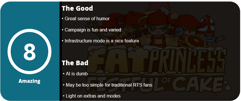 Besides all this, you can customize the units of your people and do skirmishes, but other than that, the game is light on modes and extras. Fat Princess is chock-full of internet quotes and game-related nuances, so there are laughs all around. Fat Princess is a wonderful light RTS for pick-up and plays action. Plus, the game looks and sounds great on the PSP and doesn’t lose anything from the PS3 port.
