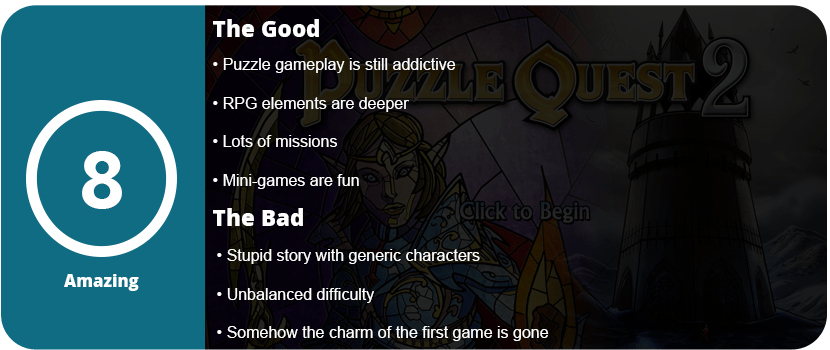 Despite the charm being gone, Puzzle Quest 2 manages to be good only because of the puzzle game it was created from, but even hours into the game, you will get sick of it and may not even finish the story. The game just feels half-baked, and I know it could have been so much better. However, if you loved the first game or just love puzzle games, this is a great game for anyone.