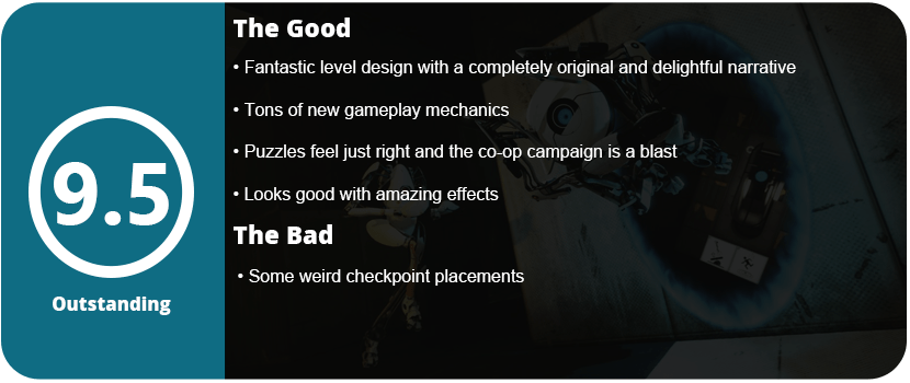 The puzzles are just so uniquely fused with the narrative that you never feel like you’re just jumping from room to room anymore. This really feels like a puzzle or adventure this time around, and some of the puzzles span two to three rooms. There’s constant chatter from characters while solving puzzles, so it doesn’t feel as stale this time around. All the new characters are great, and you’ll like them (or hate them) quickly thanks to Valve’s one-of-a-kind storytelling abilities. The music is one thing I love about this game because when you start bouncing around a room or sliding, there’s unique music that instantly plays when you’re doing these things. You get a strong sense of vertigo thanks to the game’s new take on heights, but the music is just phenomenal. This soundtrack is purchase-worthy, and the new GLaDOS song at the end is just as good as “Still Alive,” but in other ways.