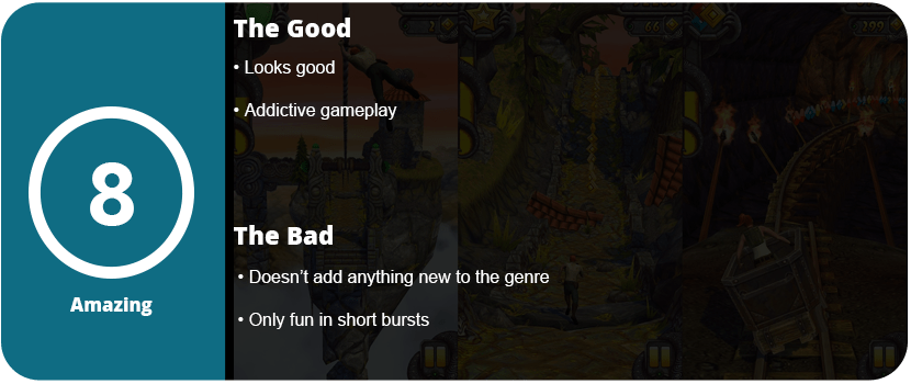 There’s obviously no story, which is just fine for these types of games, but running games are only good in short bursts, and Temple Run is no exception. Beating high scores gets addictive, but overall, the new depth is just a welcome addition to the tired running game lineup. This is all wrapped up in a sweet free package, and people with larger screens have the advantage of seeing further ahead than people with smaller phones. Temple Run is a really fun game that all mobile gamers should have.