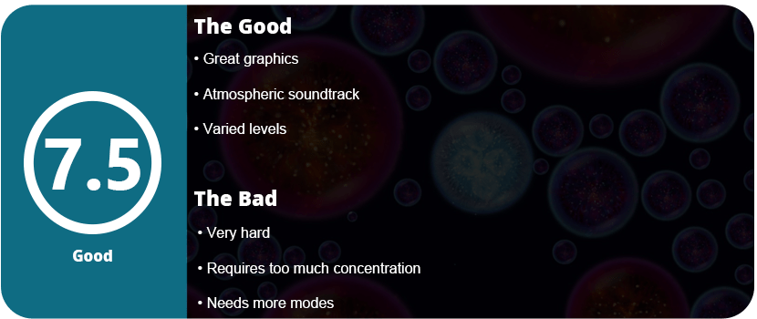 The hardest part of the game is tapping just right and keeping good speed. You can slow down time or speed it up by swiping the screen left or right. This allows you to bump bigger microbes out of the way without being consumed. The visuals are pretty decent, and the game has a nice atmospheric soundtrack, but due to the high difficulty, this game is far from relaxing.