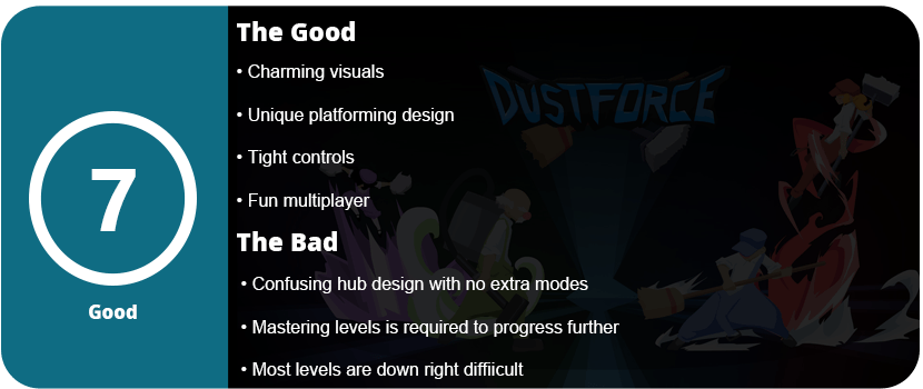 It was bound to happen. A game where you play a super janitor. Dustforce is a hardcore platformer reminiscent of Super Meat Boy, and almost as hard. The game has tight controls; however, they seem to be a bit overly complicated. The visuals are charming, but the whole package is lacking something.