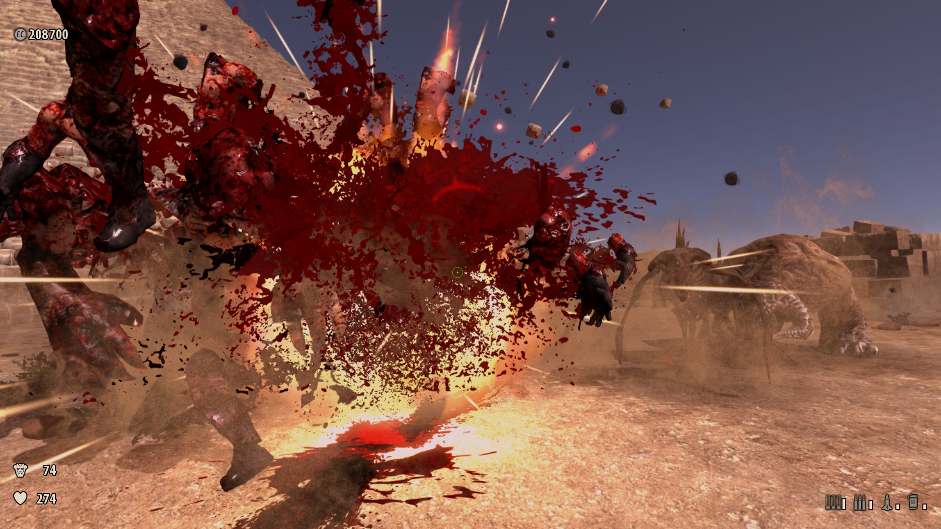 I honestly felt that my arsenal was underwhelmed by the vast amounts of enemies the game throws at you. The most effective weapons were the cannon, C4, and Devastator, but the ammo for those is pretty rare (except C4). All the rest were pretty useless except the minigun, which was good at reducing crowds in a wide area but ate up ammo quick. I can’t tell you how boring the game got by the end, and it will really test your endurance. I played on the easy setting and still got my ass kicked sometimes. For the hell of it, I tried it on the hardest difficulty, and it was impossible. I couldn’t get past the third level; it was that hard. By the last level, you are thrown probably a few thousand enemies with wave after wave that takes you about 45 minutes to chew through. The waves get so big that I backpedaled half the level to get some breathing room in some areas.
