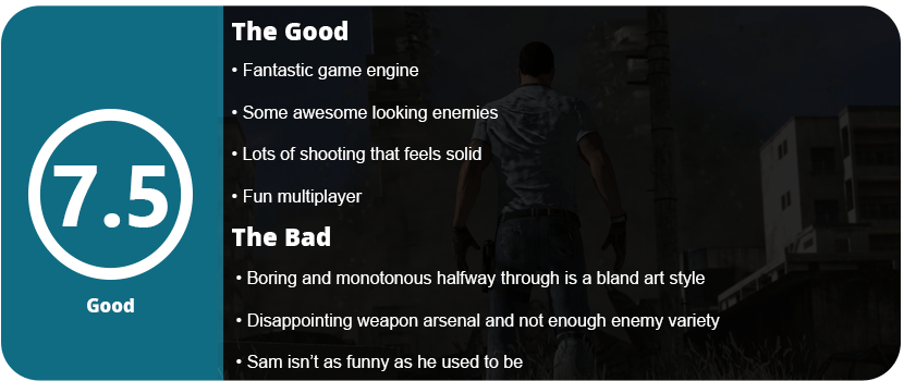 I can only recommend this to hardcore FPS fans and hardcore fans of past Sam games. The campaign is nothing special and gets incredibly boring and monotonous halfway through, not to mention freaking tough as nails. The weapon arsenal is disappointing, and there are only a handful of different enemies. There isn’t enough new here to make it a true sequel, but the game looks damn good. For the low price, it is worth a fun play-through, but don’t expect tons of people to be playing online.