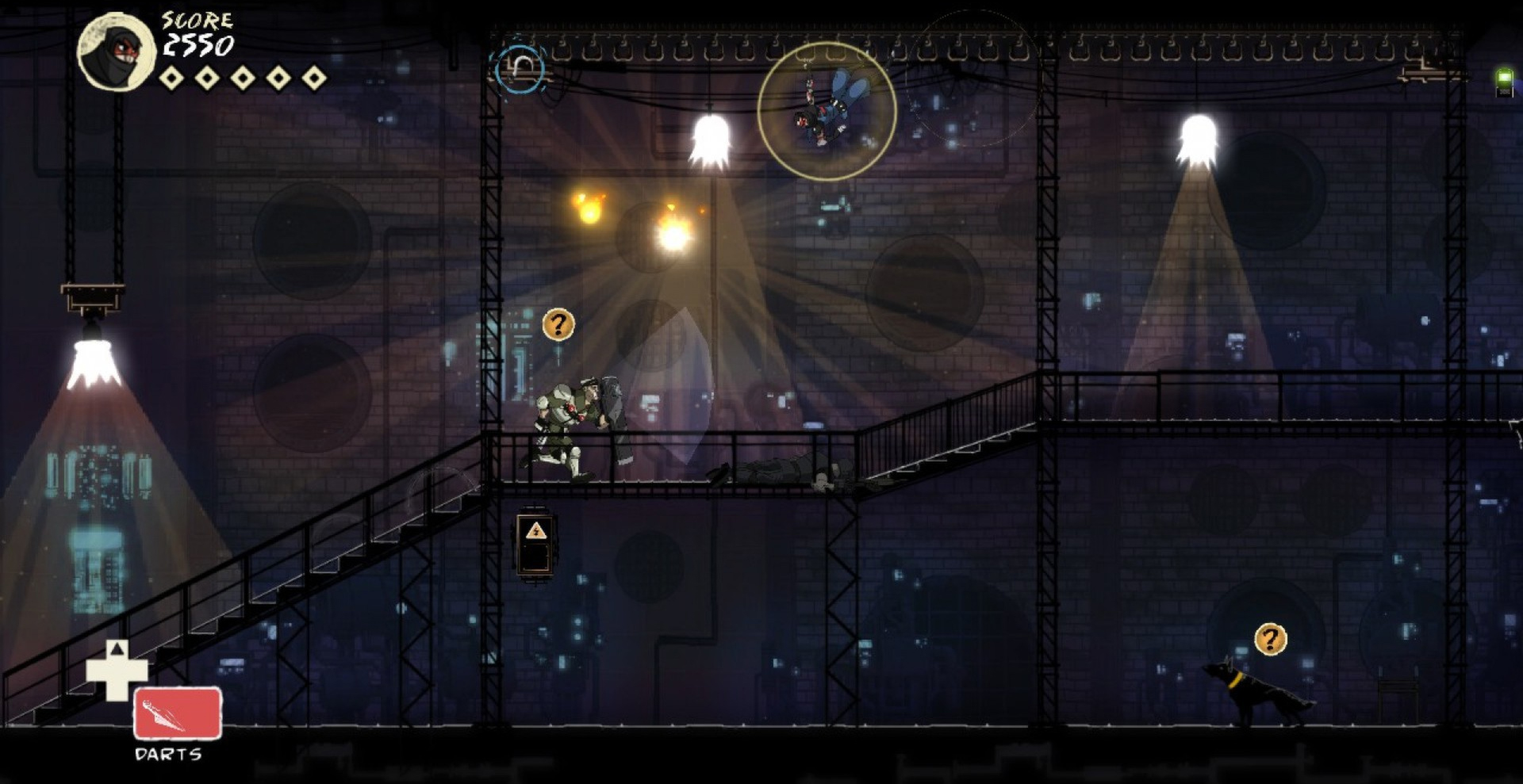 The game uses light and dark very well. The game is in 2D, so everything around you is dark. You have to avoid enemies by climbing up walls and ceilings, hiding in ducts, and even in objects. The game has a great kill mechanic where you press the kill button, but time slows so you can press a combo of a direction and the kill button that pops up on the screen. This feels very satisfying and should be incorporated into more games like this. You have some weapons in your arsenal, such as darts, that can be used to distract guards by taking out lights, luring them into traps, and many other things. You get smoke bombs, mines, and even the ability to see everything around you and teleport. That is what a ninja is really like, and I haven’t played a game yet that makes me feel like one (sorry, Ninja Gaiden).