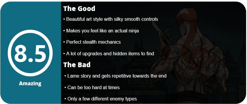 With great ninja gameplay, smooth controls, fun stealth mechanics, and interesting puzzles, Mark of the Ninja proves to be one of the best indie/arcade games this year. For the low price, you have nothing to lose except a few hours of having a lot of fun.