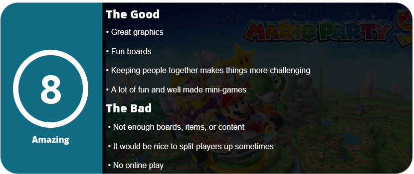 A real big letdown is that there’s no online play. This game is really only fun with other people and is completely boring for you. It’s great to relax with, but the AI is usually cheap and not fun to play mini-games against. I also wish there were other characters, boards, and more extras for the $50 price tag. The graphics look great; there’s just a lot of aliasing, which is to be expected with the ancient Wii hardware. If you have a lot of friends with whom you play games at home, this is a must-have.