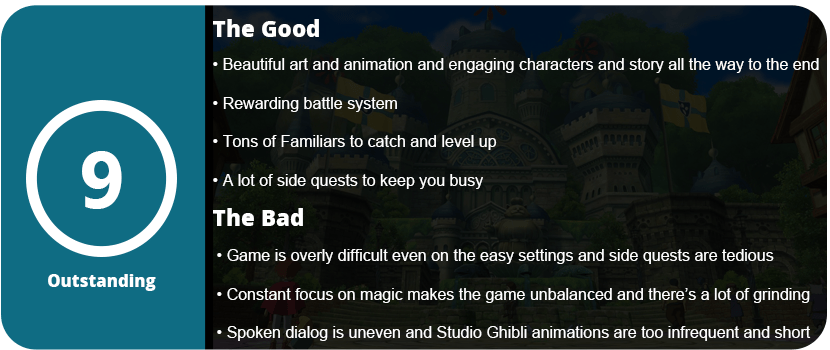 In the end, Ni no Kuni has a very engaging story that will keep you hooked for dozens of hours. The combat tries to change things from the typical JRPG format, but there are a few flaws in it. Your spells can be interrupted often, and when you defend, sometimes they won’t register or you don’t get enough time before the enemy attacks. You get about a second before the enemy attacks. During that time, you need to order your team to defend themselves. It can be tough during boss fights. I also hated the focus on magic, and the game was overly difficult during the last 3/4. Other than that, the combat was fine. The game suffers from tedium towards the end, and the side quests start feeling the same, and you just want the game to end. There is some post-end content, but most people might skip this. Ni no Kuni is a perfect game for JRPG fans, but non-fans won’t find enough here to change their minds.
