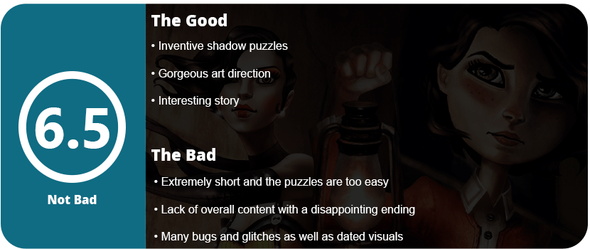 The game itself can be beaten in about 4 hours. The graphics are really nice; however, they are a little dated, and there are numerous bugs and glitches. The game would crash; Dawn would get stuck in a T pose during certain jumps; Crates would get stuck due to weird physics issues; and they all required restarts. That’s unacceptable, and hopefully it will be patched. I honestly can’t recommend this game for the asking price, but maybe for a sale, it would be worth it. The game isn’t bad; it just seriously lacks content and depth and has a disappointing ending. The shadow puzzles are very inventive and fun to do, but they just need to be more.