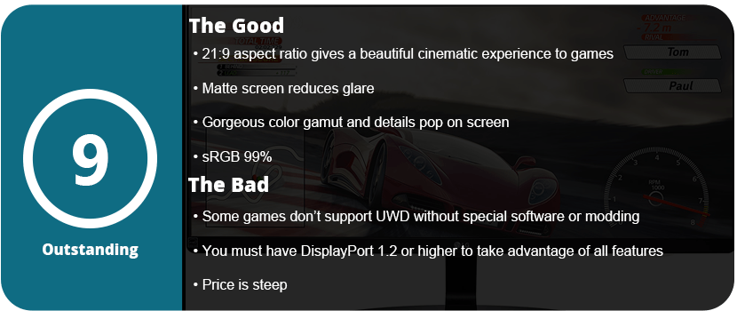 Ultimately, I can only recommend spending the money on a UWD monitor if you game or do art of some sort. For someone who just uses their computer as a glorified Facebook and Instagram machine, you’re throwing money down the drain. While everyday use is nice on a monitor like this, there’s no advantage over a normal 16:9 monitor that can justify the double price jump. You also need to have a pretty high-end rig to start rendering at these resolutions so you can keep your FPS up to take advantage of the monitors’ Vsync features. While the monitor changes its own refresh rate according to the FPS, it helps to keep it stable and as high as possible.