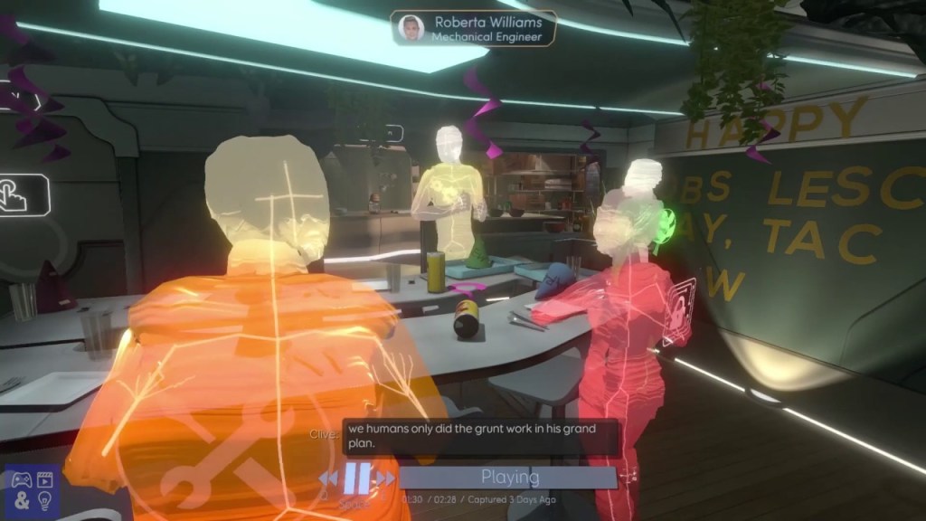 This type of game won’t be for everyone. I love great stories and characters and can enjoy them without any action at all if they’re done right. Tacoma comprises three explorable areas, each with useless interactive objects, but once you get to an area, you use the AI to replay what happened in that area via holograms that walk around. You can fast forward and rewind the hologram play, and in between, there may be some holograms with HUDs that need to be interacted with, and these are marked as question marks on the timeline of the event you are watching. Finding these holograms and interacting with their display allows you to gain some insight into those characters. Honestly, it’s nothing super special or interesting. The issue is that the overall story and larger picture don’t really sit and integrate well with the characters. They feel like a side story.