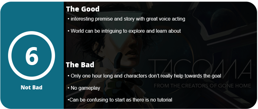 The visuals are decent, and the art style is nice, albeit forgettable. The voice acting is great, and there are some interesting concepts at play that are just barely touched upon and then abandoned. Tacoma doesn’t give the already struggling adventure genre any hope or appeal to gamers who shy away from them either.