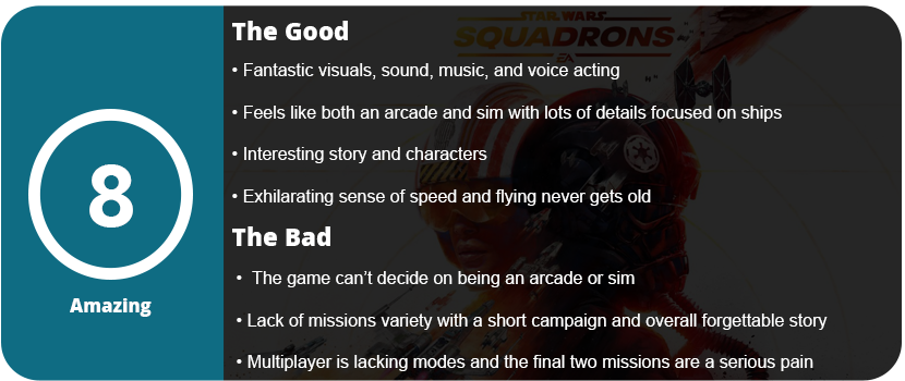 The multiplayer is something that I felt wasn’t fun for too long. Unless you master the controls and a specific ship, you’re going to die a lot. There are dogfights and missions that have you taking down larger ships and working together. I found the dog fights boring after some time, but the bigger battles were a lot more entertaining, but I still don’t see this game having longevity in the multiplayer department for very long. Overall, the game plays, looks, and sounds great, but it feels like it wants to be more of a simulator than an arcade game sometimes, and in others, more arcade. It needs to either balance these out better next time or pick one. I wanted more mission variety, a more epic story, and the ability to walk around the shipyards. What’s here is fantastic and should be played by flight game fans or Star Wars fans.