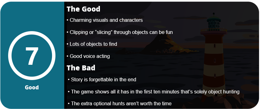 Overall, I Am Dead is a fun object-hunting game for a few hours, but the story, in the end, doesn’t wow you or have a twist ending. It’s pretty predictable, and the extra puzzles aren’t worth your time as there is no reward outside of just doing them. The visuals are charming, and there is a lot of detail put into the objects you examine, but the entire game shows everything it can do in the first ten minutes and never evolves beyond that. If there was something more to this game than just clipping through objects for 4 hours until I found what I needed, I would stay longer, but this game is mostly for object hunting fanatics.