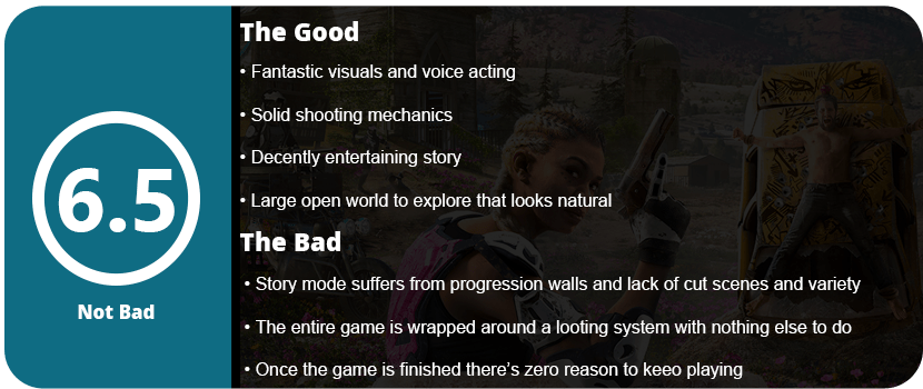 Overall, New Dawn is worse than Far Cry 5, but taking out all the fun and wrapping the game around a grinding material hunting fest and smacking you will progression walls constantly. The map is too large and empty; there aren’t really any modes or things to do outside of looting materials; and the only really entertaining parts of the game don’t get much screen time. This feels like the most useless Far Cry game to date, as if it never existed, anyone would miss it. Even if you did play Far Cry 5, there’s no reason to even play this outside of sheer boredom. The shooting is still solid like always, and the visuals are amazing, but that means nothing when it’s inside of a boring, empty world that forces the player to play the game a certain way and then gives them the finger when the game is completely over.