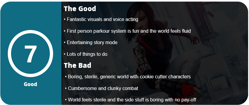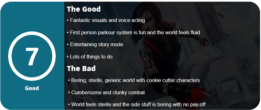 That’s pretty much all there is in the game. It looks fantastic as it pushed the Nvidia 10xx series cards to their limits when this game came out, and I remember my GTX 970 couldn’t run the game on Hyper settings at 60FPS. It just looks so good, but again, it is very sterile and boring to actually be in. The main missions provide entertainment for about 8–10 hours, but the extra side stuff is a pointless borefest. The parkour system combined with an open world just isn’t interesting enough to justify spending 50+ hours completing everything. Every area pretty much looks the same, and the characters are boring and generic. I feel the series needs a complete overhaul, if it even gets one. Due to poor sales of this game, we may be seeing the end of Faith. Stay for the story, and then don’t bother after that.