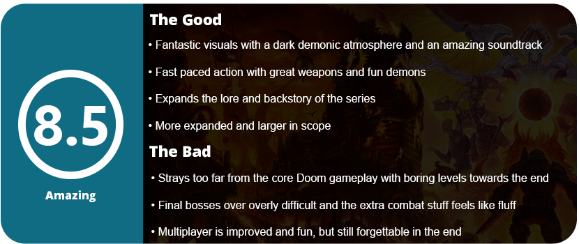 The multiplayer in Eternal is much better than Doom 2016, as PvP is out the window this time in favor of demons vs. the Slayer. Two demons and AI bots versus one slayer is kind of fun at first, but after about 3–4 hours in these modes, I was over it. It just doesn’t hold my interest like Unreal Tournament or Quake’s Deathmatches did. Doom was never really well known for multiplayer, and while it’s much better here, I wish it would just focus on single-player only. Overall, what we get is a great sequel to Doom 2016 with fantastic visuals, a rocking soundtrack, great weapons to shoot and demons to kill, and just amazing fast-paced shooting. The last few levels are boring and overly difficult, and the added stuff to combat feels like filler and fluff to pad a game that was already great.