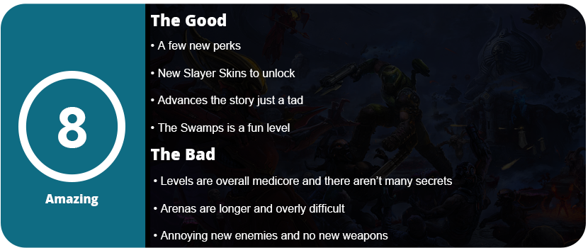 Overall, The Ancient Gods is still fast-paced and fun in Eternal Combat, but it’s just not enough new to be considered anything more than some lost levels. Fewer secrets, new annoying enemies, insanely pumped-up difficulty, longer and less interesting levels, and only three new perks. It’s still plenty of fun, and if you finished Eternal early on, then this will give you a few hours of mayhem to get another taste, but it’s nothing to write home about.