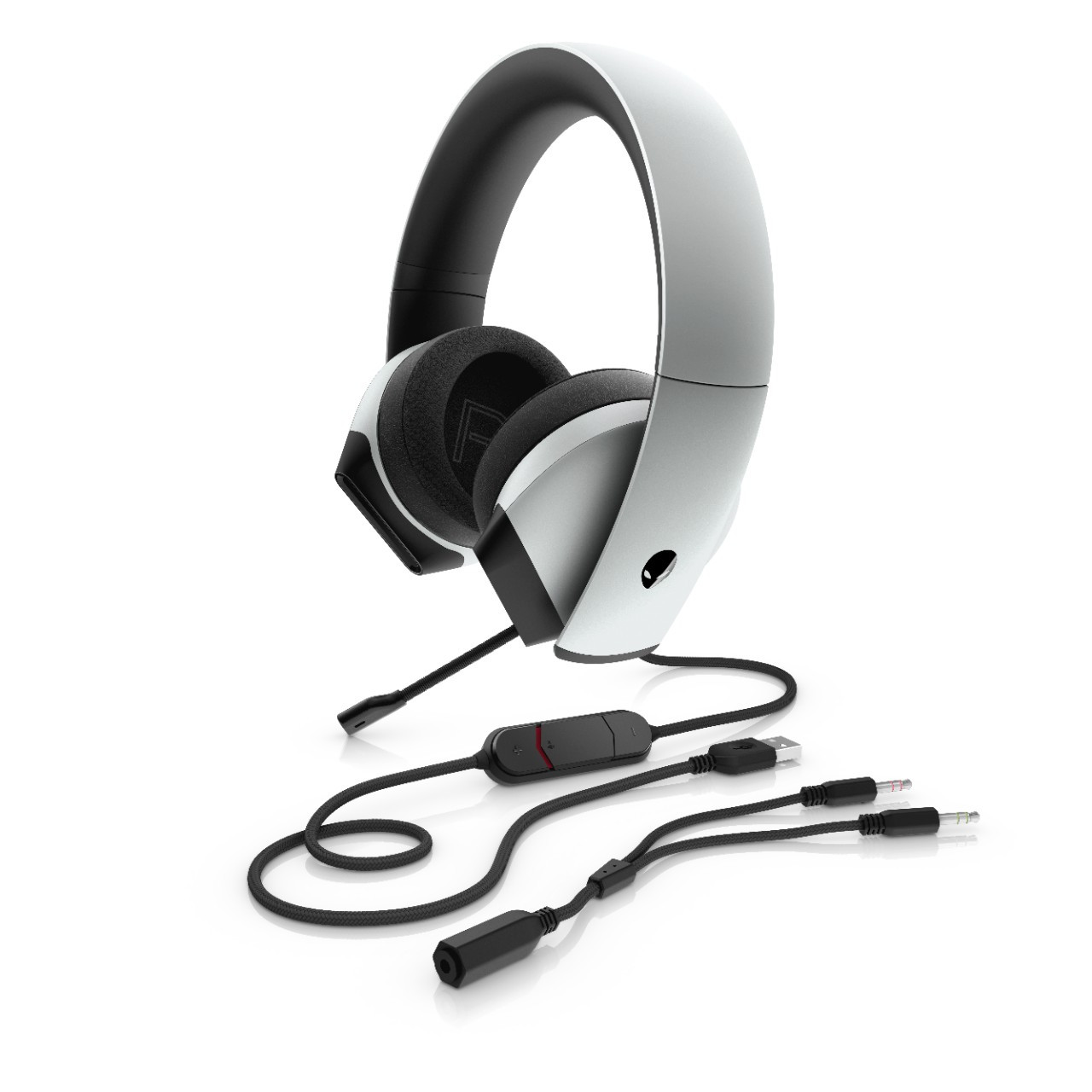 The unboxing experience is quite nice as the box is very large, and when you open it, the headphones are just laying there strapped in with velcro ties. Below it is a compartment that houses the cables, and that’s about it. The headphones are quite heavy and bulky, but for my large head, they felt fine. The strap cushion is rather nice and made of a soft silicone rubber-type material, and the ear cups are large, soft, and cushy. The earphones adjust inside the strap rather than lengthening it. I found this rather nice, and the cups always swing out 90 degrees, so they rest flat. There is a nice alien head logo on each ear cup and the name across the strap. They are very minimalist and sleek-looking. I picked the white ones to match my Lunar Light laptop and mouse.