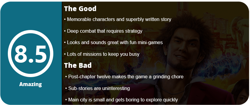 This is the first time I’ve finished a Yakuza game and a rare completion of a JRPG. Usually, JRPGs have great stories and characters, but something within the game keeps me from finishing it. Be it unfair and insane difficulty, too much grinding or late-game issues pop up like needing to quest for something very specific and it makes the progression grind to a halt. Like a Dragon is the first in the series to play like a JRPG and not an action game. The story is fantastic and the characters are well written and memorable, but that’s probably the strongest thing going for the game, and it’s the reason why I slumped through the late game issues to see it through to the end.
