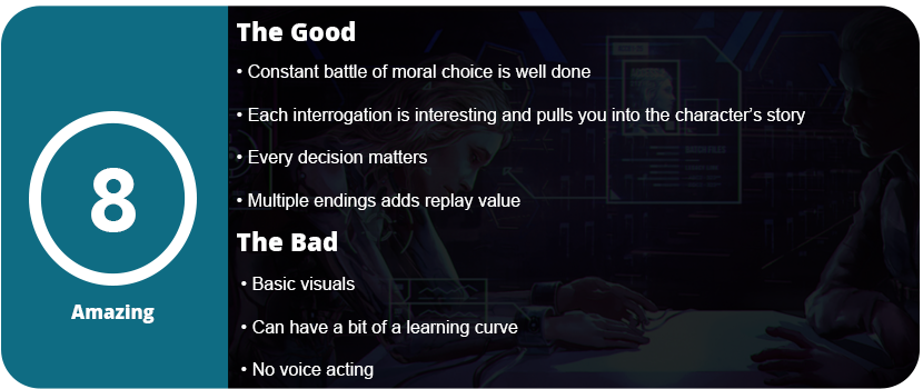Overall, Silicon Dreams is a fantastic text adventure that pushes the moral boundary of AI as humans and makes you think with every mouse click. I had to make sure I even talked about certain topics in a certain order to open up trust first before talking about the actual reason why the subject was with me. Sometimes this worked and sometimes it didn’t, but that’s part of all the fun in this game.