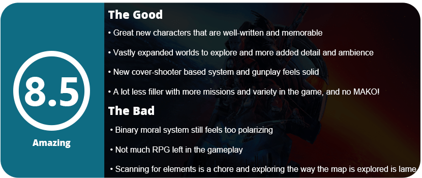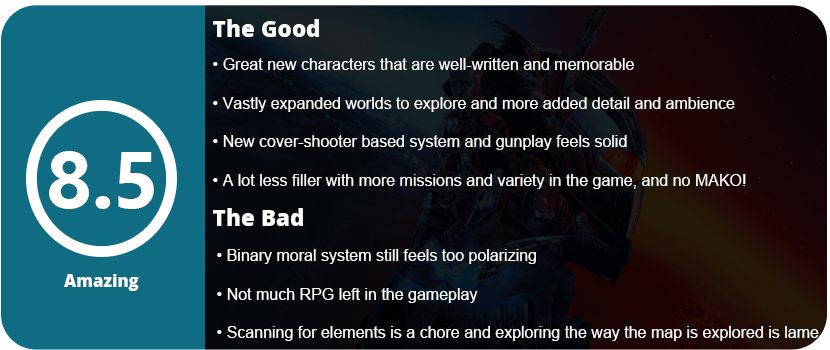The main story is still really short, with only maybe half a dozen missions or so. The last three crew members are optional, and there are a couple of crew members attached to DLC. Sadly, these crew members don’t have any dialog trees, and their characters aren’t expanded upon enough. With that said, the new characters are really likable, memorable, and well-written. The expanded lore and world feel grand despite the game’s actual limited scope. I felt I had more control over the dialog, but the binary moral system is constricting in itself and is one of the main issues I have with the whole series. The game is about as long as the first, but it feels more satisfying as you aren’t spending 10+ hours driving around in a boring MAKO. I finished almost everything in about 35 hours, and it feels solid and thorough. Less filler was scrapped for more actual content.