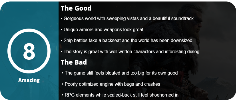 Overall, Valhalla is a fun game and a well-made AC game. It does feel bloated with too much optional stuff to find around the world, but it’s just optional, and you aren’t forced to find it like in Odyssey. I was able to complete both main storylines easily, and the RPG elements scale nicely with the story and can even be turned off. The game looks and sounds amazing despite the poorly optimized engine, and the story was actually good with well-written dialog and characters I cared about. There were even unique assassinations! However, the series still needs to scale back and just go back to the way AC was in the past. One single story had a beginning and an end, with some optional content thrown in. It takes 50 hours just to complete the main story after completing all pledges, and then another 20 hours to level up enough to finish the Order storyline. Over 100 hours in to actually get 100% completion, possibly even 120, and that doesn’t include the DLC that can take 15-20 hours to easily 100% those! It’s stupidly bloated and feels insane, but thankfully, it’s just optional. AC in general just doesn’t have an interesting gameplay loop for grinding, and it was never supposed to be an RPG. These elements feel shoehorned in as an excuse to make the world bigger and extend gameplay time. The series has never needed any of these.