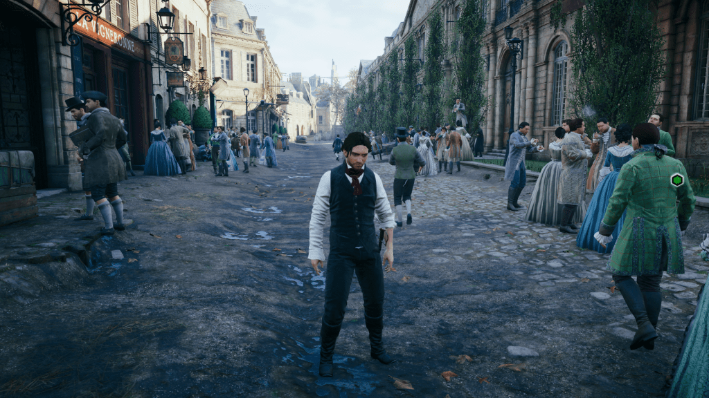 I found these side objectives to be rather neat and fun. Sometimes you can free some people to start a distraction and clear out an open courtyard, which gives you quick access to the target. The assassination opportunity puts you right in front of your target without being seen. One mission had me kill someone attending a ball in a mansion. I freed a fireworks cart that would force the target out of the ballroom and into the hallway, which let me blend in with the crowd and kill her without fighting through guards. Some of these were fiddly, and you have to be in the right position at the right time or you will blow it, so a lot of trial and error is still needed, which can be really frustrating but satisfying once you figure out where the target is and the quickest way to get to them. I did find that traversing the buildings can still feel finicky and too sticky. Sometimes I just wanted to hop down to go to a specific platform, and Arno would hop around like a bunny and jump down or go up to something when I just wanted to run straight. It made me fail some missions, and this is still an issue that needs to be addressed.
