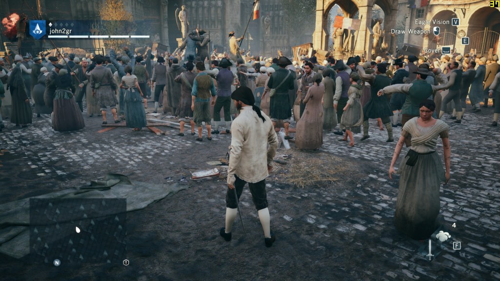 Up until this point, Assassin’s Creed had pretty much overstayed its welcome. With the release of Rogue, it was clear Ubisoft was just wanting to use the series as a yearly cash grab. While no single game is inherently awful or bad, the formulaic nature of every game playing nearly the same but with new characters and stories just wasn’t appealing anymore. The game was starting to feel less unique and made from love and care and more like just copying and pasting and inserting a few new characters. Unity was the series’ first next-gen outing with updated visuals, mechanics, and co-op. Unity scales the series back to its roots and focuses solely on the narrative and less on varied mechanics. For instance, naval battles are gone as the game focuses just on Paris, set during the French Revolution. So, like in the original games, we get to run around a large town area full of chests, side quests, and things to collect to gain money to buy customization pieces. Then there’s the meat of the game, which is the story missions.
