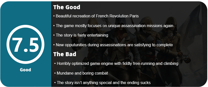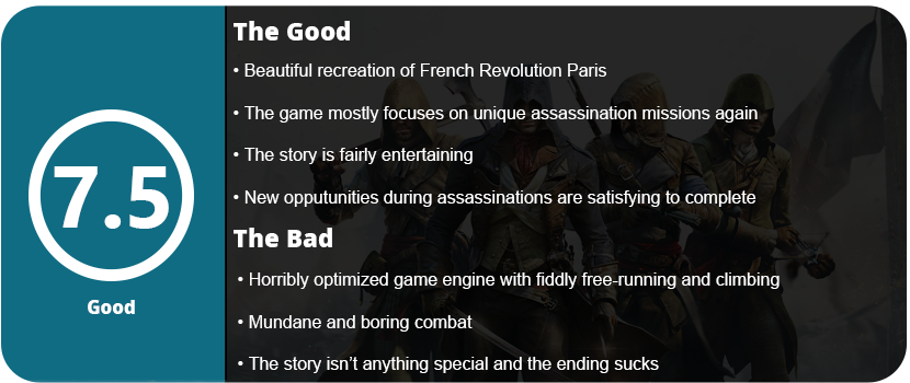With that said, Unity isn’t the worst AC game, but it’s not the best either. I appreciate the return to simpler times with just a core story to focus on and one city to explore on foot. There are still too many side activities to pad the game, and the ranking system is guilty of this as well. Combat is still boring and rough-looking, and climbing around things is sticky and fiddly. While the new opportunities during assassinations are fun to accomplish, it makes the trial and error that much more prominent and frustrating, despite the satisfying pay-off. Unity is worth a play-through if you