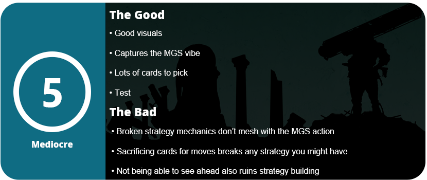 Once you move, you can pick a direction to face and whether to stay in the current position, crawl, or flatten against a wall so you can knock on it and distract a guard. The second biggest issue is not being able to tell what the guard patterns are or being able to move around the map and see what’s ahead so you can plan. The whole point of a strategy game is to plan, but Kojima wants you to do things on the fly with a turn-based card system. What? Most of the time, I restarted levels over and over because I got stuck in a situation in which I was spotted, the alarm sounded, and I had too many enemies on me and not enough fighting cards. The alarm runs down in three phases at 15 seconds each, and it takes around three turns to get to the next phase. You’ve been in alarm mode for about nine turns! What?!