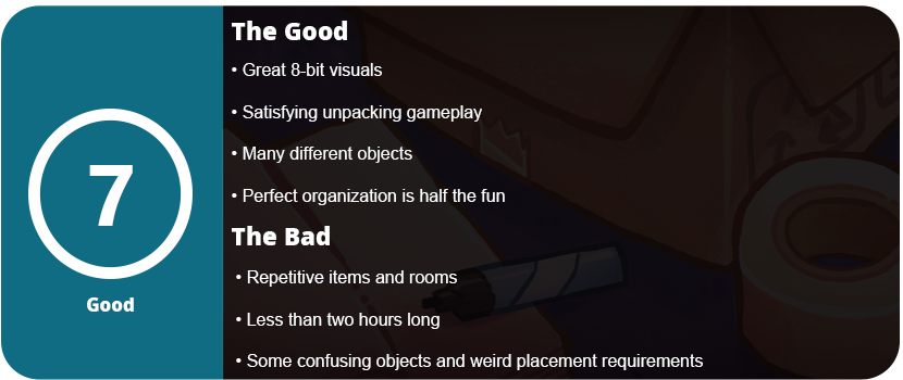 There are a few challenges when it comes to space. Some rooms will be very minimal with a lot of items, and you have to be clever and organized to get everything to fit. Once you unpack every box, items that are in the wrong place will flash red, and most of this made sense, but some didn’t. Why do I have to put a backpack on a shelf when on the bed makes sense? There were a few cases in which I couldn’t make out what the items were at all, which had me clicking and placing them on everything until I found the right spot. I also wish I could unpack the furniture and literally unpack an entirely empty home. Maybe some outdoor areas would have been nice, like backyards, sheds, garages, or other settings like offices, which would have added variety.