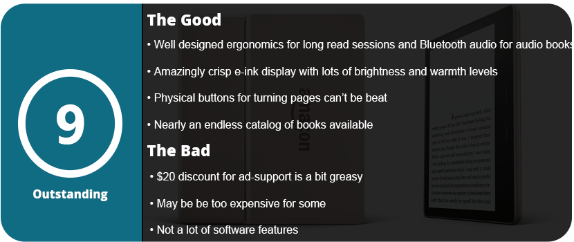 With this being the high-end model, I can only recommend it to people who want physical buttons or a much sharper and brighter display, as it’s well worth the extra price. You can even knock the price down to $250 by just getting the 8GB ad-supported model. I also recommend the excellent, high-quality cases, despite the high price point. This is for hardcore readers only as well. Don’t expect to read comics and graphic novels with this device. You’re just going to get straight-up text reading out of this, but remember that the display is built for this by design and regular tablets are not. You can read this thing for hours on end and not get any eye strain. It’s a wonderful device for all ages, and I can’t recommend it enough despite the price being too high for some. Think about this, though. After about 20 book purchases, you’ve paid for the Kindle itself and saved that much room in your house.