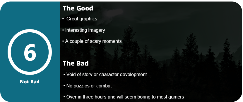 The sad part about this game is that it doesn’t break the Lovecraftian video game stereotypes. Usually, they’re clunky, void of any type of cohesive or interesting story, no character development, and just really weird imagery. The Alien Cube doesn’t help this at all. I still feel Dark Corners of the Earth is the best Cthulhu-based game so far, and it hasn’t been beaten. While it’s clunky by today’s standards, it’s a much longer adventure and actually has somewhat of a story. Outside of just walking forward forever, the graphics are rather decent using the CryEngine, but not on a level we’ve seen in the past. Most of the game is very dark and foggy. It can also be finished in less than three hours.