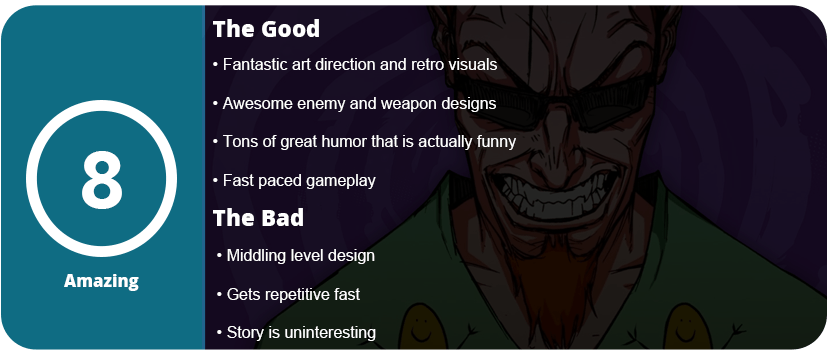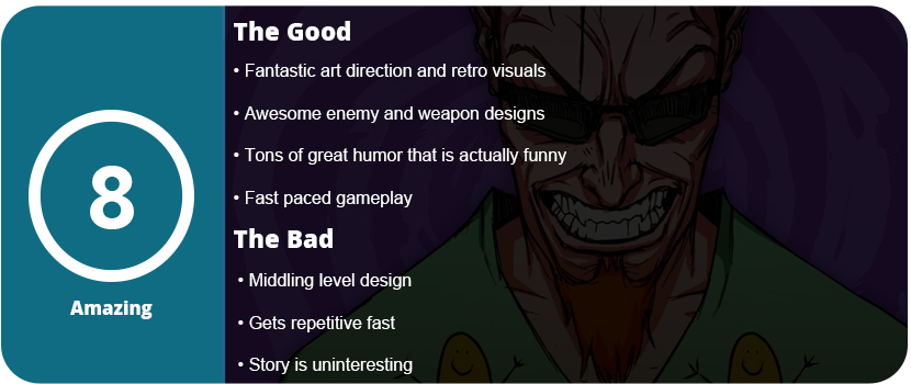 Overall, Brain Damaged has excellent art direction and retro visuals that harken back to the 64-bit era of games like Quake II and Unreal Tournament. The controls are great, the game is fast-paced, the weapons and enemy designs are awesome, there is varied level design, and the humor is actually funny and not offensive just to be offensive. There are plenty of nods to video games, gaming culture, and world events from the last five years that everyone can relate to. If you can get past the repetitious design and so-so-level design problems then you will have a great 5-6 hours on your hands.