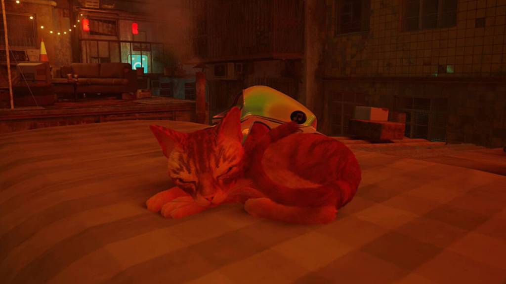 Stray has some really good pacing. It’s a very short game that can be completed in a single sitting, but it has exploration, puzzles, scripted action events, stealth, and collectibles. That’s a lot to back into 5 hours and it’s done very well. Let’s start out with the obvious. This is the best representation of a cat in any video game. The animations are insanely realistic, you get a meow button that’s pretty much useless, but it’s there, and you can do cat things like knock stuff over, sleep, scratch on carpets and walls, and get paper bags stuck on your head that reverse the controls. While it may seem superfluous on the surface it helps add to the love of cats that the developers have even though none of these things really involve advancing the game further.