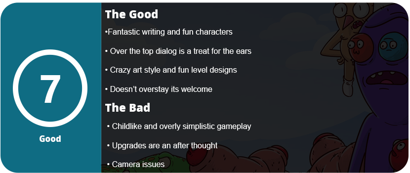 Overall, Trover Saves the Universe is full of Rick & Morty humor cranked to 11, but offers simple childlike gameplay. If you hate the show you will hate this even more, but fans of the show must play this. The over-the-top writing that you never see or hear in video games is a breath of the fresh air and it’s never boring. Once you finish the game there’s no reason to come back, but the time spent is worth the price of entry.