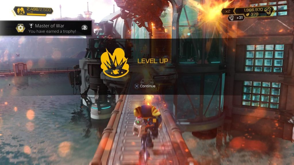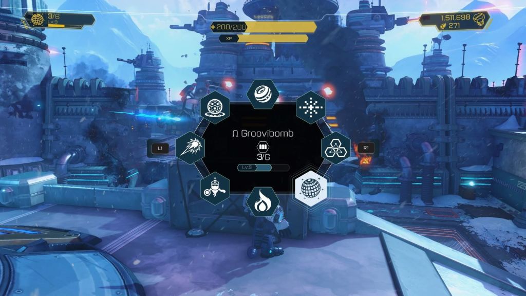 You can buy new weapons from the Gadgetron vendors and upgrade weapons with Raritanium. Upgrading is a must for getting max damage, more ammo, and extra bonuses. I recommend you upgrade all the weapons you mainly use first, as one play-through will let you upgrade maybe 2-3 weapons to 100%. Outside of weapons, there are a few passive gadgets that let you progress through levels, such as the Trespasser, which involves solving puzzles that can get rather tricky. There are a few hoverboard race sections, and of course, you need to acquire bolts in the game by smashing boxes, defeating enemies, and completing objectives. I do want to mention one aspect of R&C that’s fun and unique: seeing hundreds of bolts on screen fly around as enemies explode and boxes blow up, and going around and collecting all of these. It’s something in the game I’ve always thought was fun.
