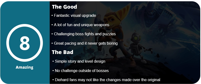 Overall, Ratchet & Clank is a fine remake of the first game, and only diehard fans will notice the changes to the story, characters, and missing levels. The game is unique, helped define the PS2, and has that PlayStation DNA that stands up today. It’s a fantastic series, and I hope future games get remade in the same fashion. The game is a bit on the easy side and only offers a challenge during the boss fights, but it’s a fun dozen hours that you can’t get on any other system.