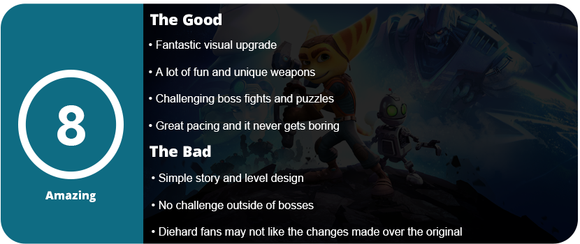 Overall, Ratchet & Clank is a fine remake of the first game, and only diehard fans will notice the changes to the story, characters, and missing levels. The game is unique, helped define the PS2, and has that PlayStation DNA that stands up today. It’s a fantastic series, and I hope future games get remade in the same fashion. The game is a bit on the easy side and only offers a challenge during the boss fights, but it’s a fun dozen hours that you can’t get on any other system.