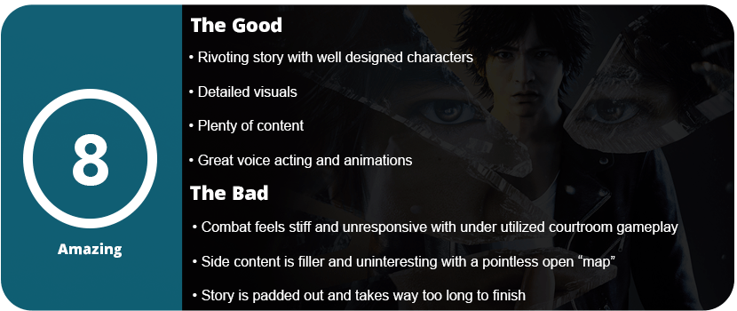 Overall, Judgment excels in storytelling and character development but falters in gameplay. The fighting is stiff and unresponsive, the mini-games are repetitive and pad out the hours, and I felt the detective work in the courtroom was a missed opportunity. The open city is an excuse to throw side cases and missions at you that are meaningless and just pad gameplay. Random city fights are annoying and get in the way of progress, and the visuals aren’t much of an upgrade. What’