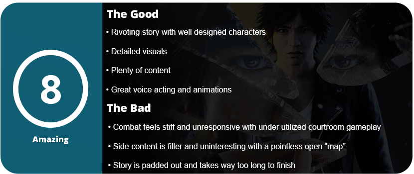 Overall, Judgment excels in storytelling and character development but falters in gameplay. The fighting is stiff and unresponsive, the mini-games are repetitive and pad out the hours, and I felt the detective work in the courtroom was a missed opportunity. The open city is an excuse to throw side cases and missions at you that are meaningless and just pad gameplay. Random city fights are annoying and get in the way of progress, and the visuals aren’t much of an upgrade. What’