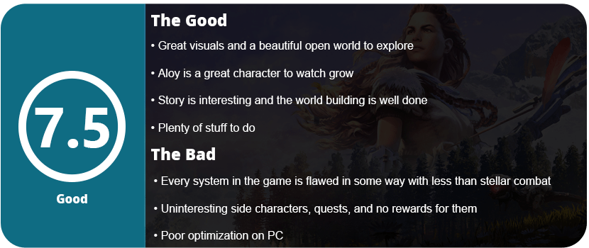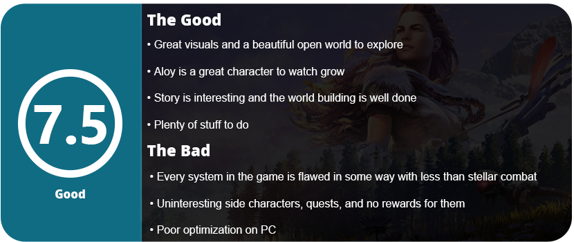 Horizon: Zero Dawn is a game I have struggled to finish for five years now. It’s not that it’s a bad game or a boring one; it just has a lot of promise in the beginning third of the game, and you quickly learn it has shown everything it has to offer by then. I got frustrated with the game more often than I wanted to. I found the game to be bloated with too many activities and very little reward for them. However, it’s the game’s less-than-stellar combat that has made me continue to turn the game off many times over the last five years.