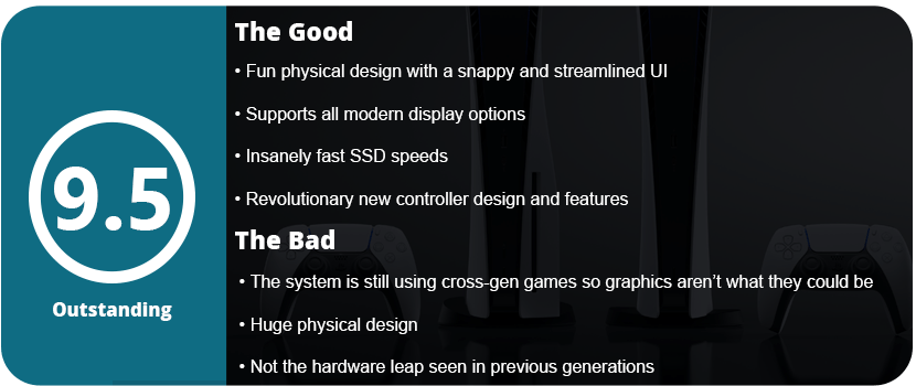 In the end, the PS5 is a fantastic new system that has faced some serious odds. With a radically new physical design, a snappy and streamlined UI, support for all of the modern cutting-edge display technology, and a revolutionary new controller, the PS5 is the best system out there in terms of an overall worthwhile package. While the games need to move away from cross-gen support to really utilize the PS5 to its full potential, slow sales and unavailability are preventing this. However, with patience, I think the PS5 can really be something amazing in the next few years.